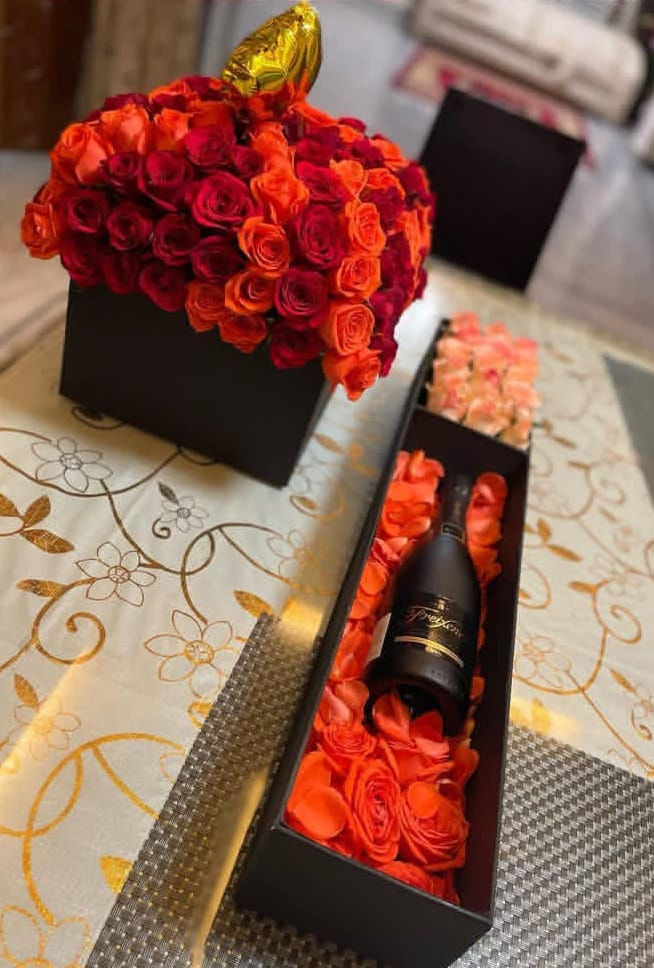 This project showcases luxurious gift boxes and floral arrangements. The images depict elegant floral gift boxes, luxurious transparent boxes with red roses, and heart-shaped boxes with roses and chocolates.